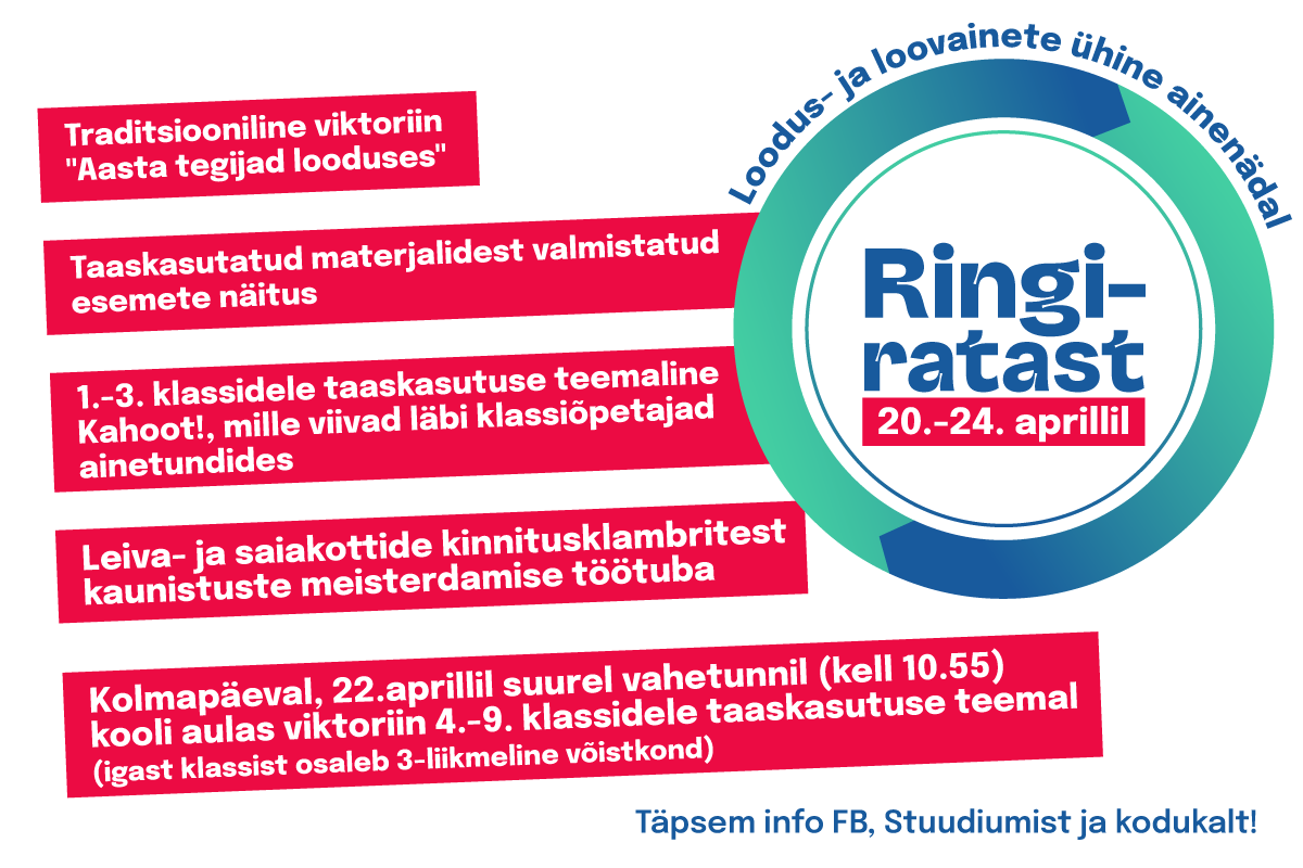 - Kolmapäeval, 22.aprillil suurel vahetunnil (kell 10.55) toimub kooli aulas viktoriin 4.-9. klassidele taaskasutuse teemal (igast klassist osaleb 3-liikmeline võistkond)