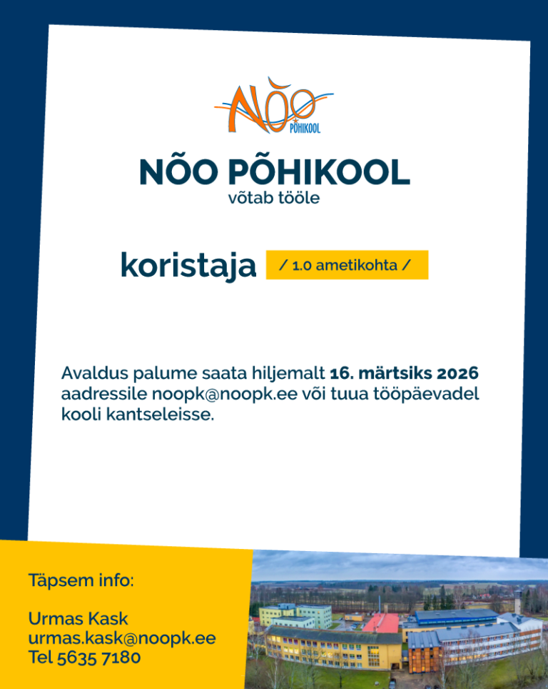 Avaldus palume saata hiljemalt 16. märtsiks 2026 aadressile noopk@noopk.ee või tuua tööpäevadel kooli kantseleisse.