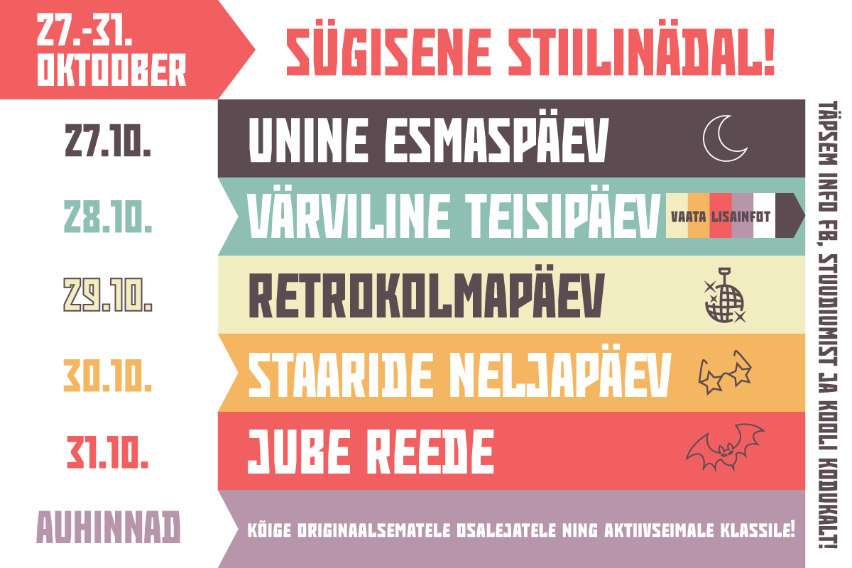 Igal päeval auhinnad kõige originaalsematele osavõtjatele ning nädala aktiivseimale klassile igas kooliastmes!